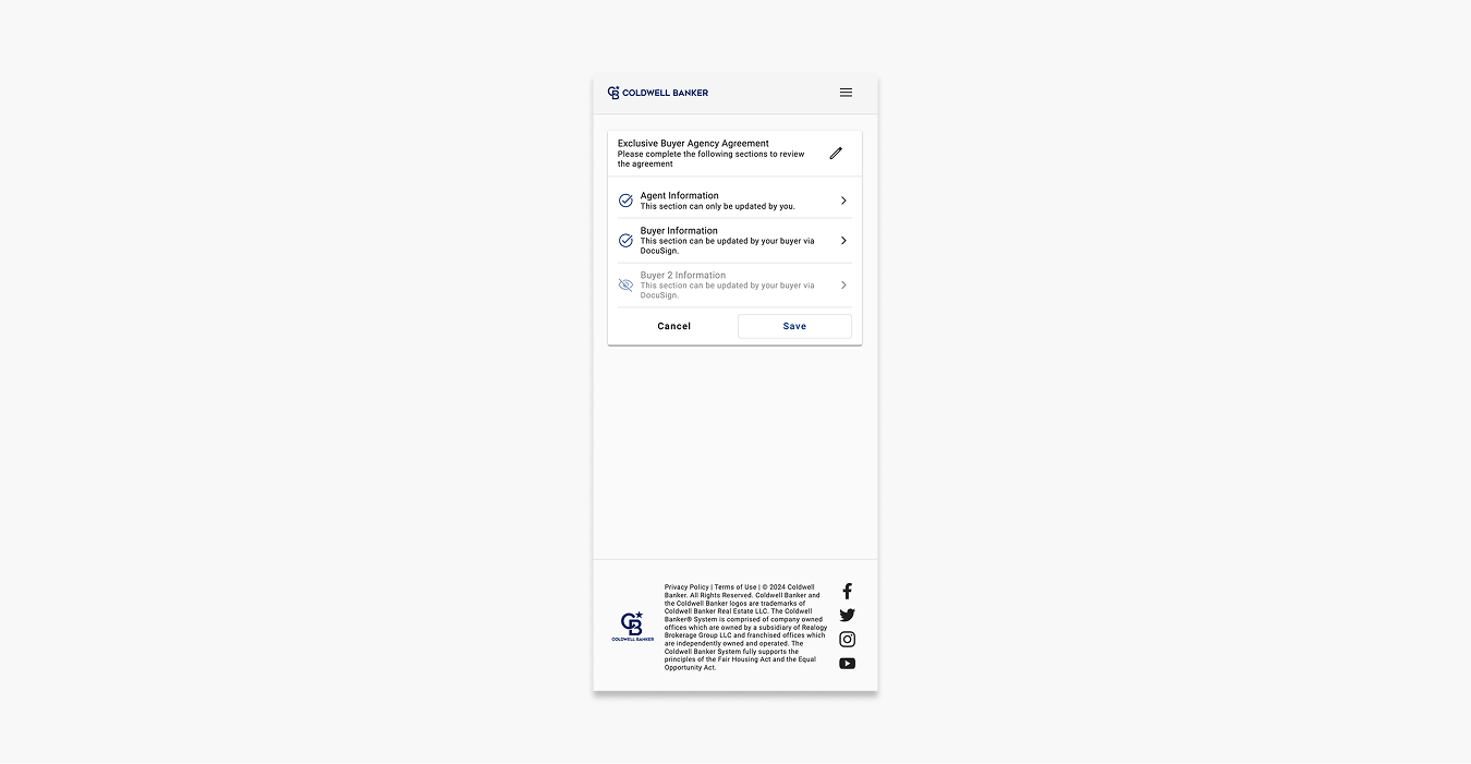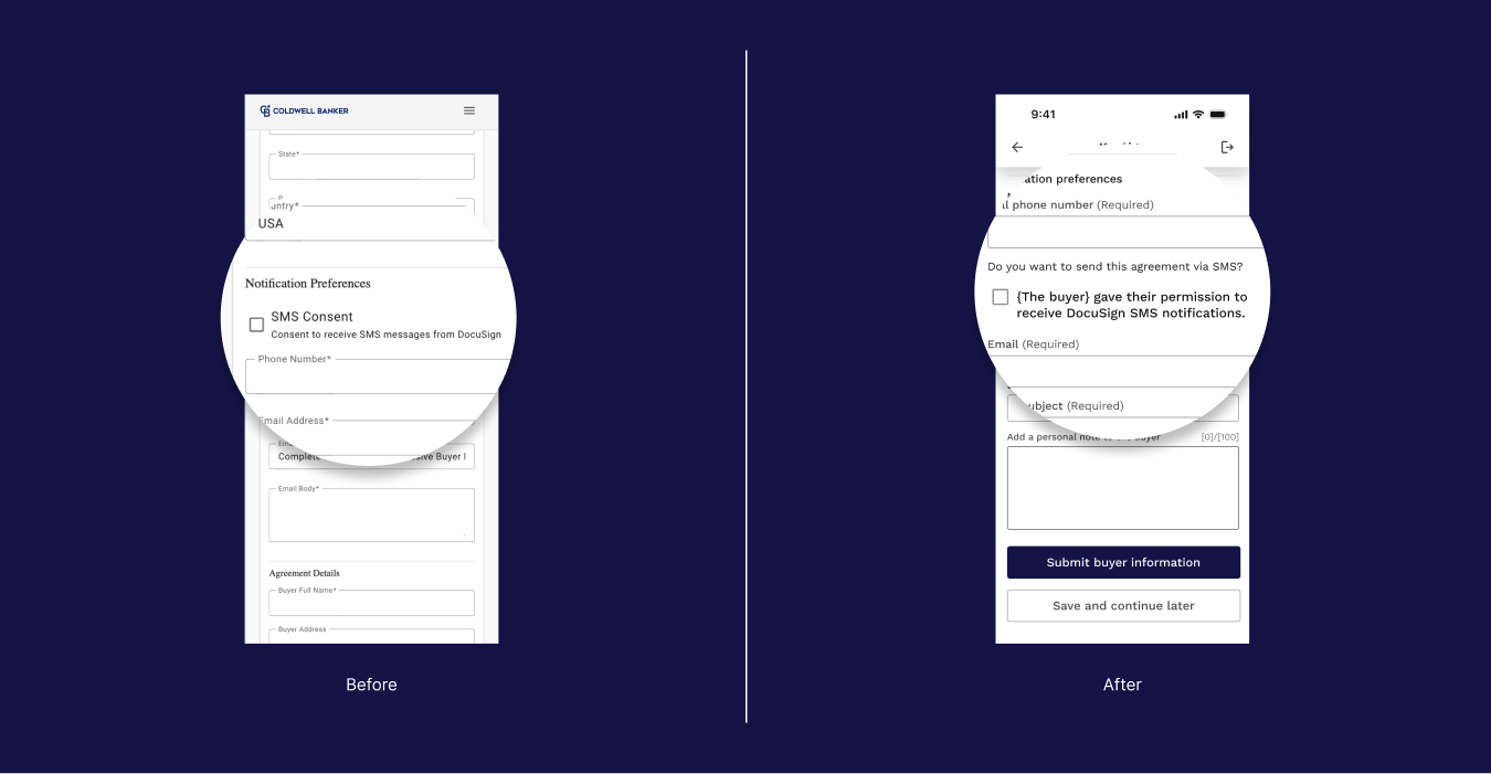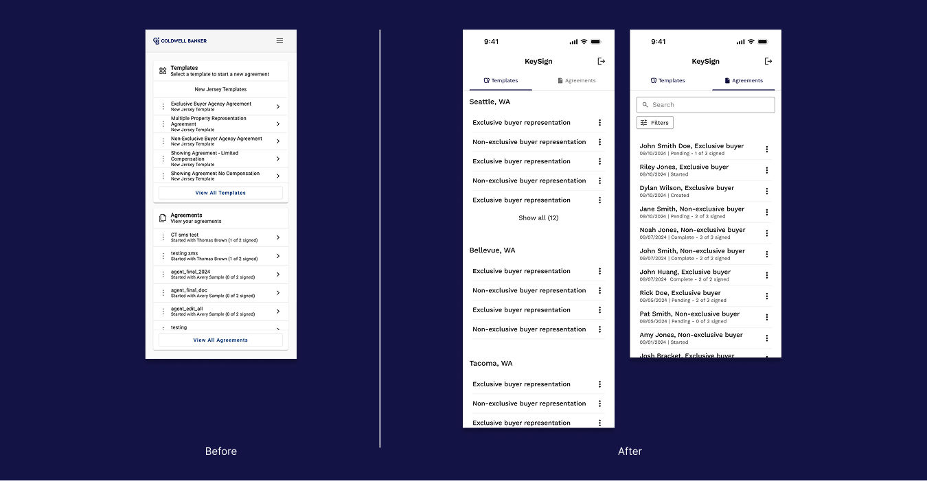 Engineering quickly built a mobile-first prototype that allowed agents to complete templates and send agreements to buyers for signature through DocuSign. UX was brought in later in the process, and the experience needed refinement to make it clearer, more scalable, and easier for agents to manage their agreements.
