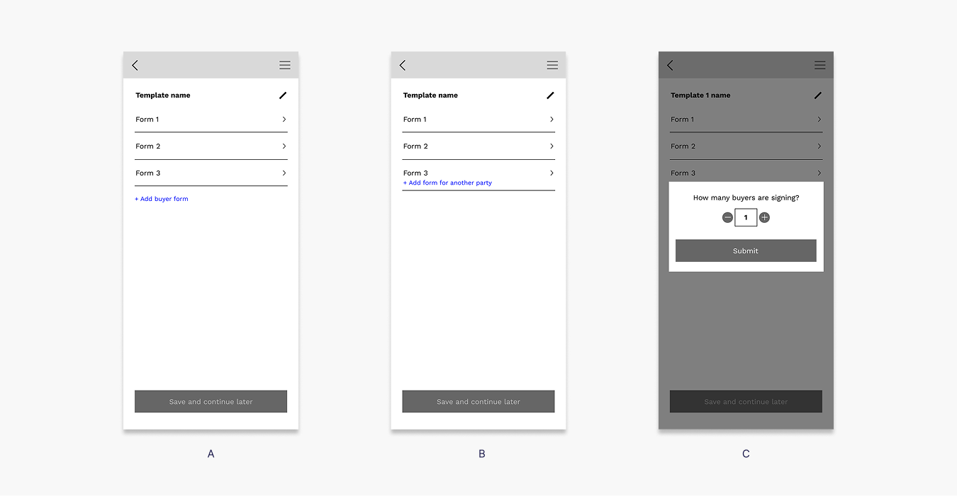 My initial wireframe explorations proposed solutions like asking upfront how many buyers the agent needed, adding an ‘Add ‘ button, and creating dynamic conditional fields.
