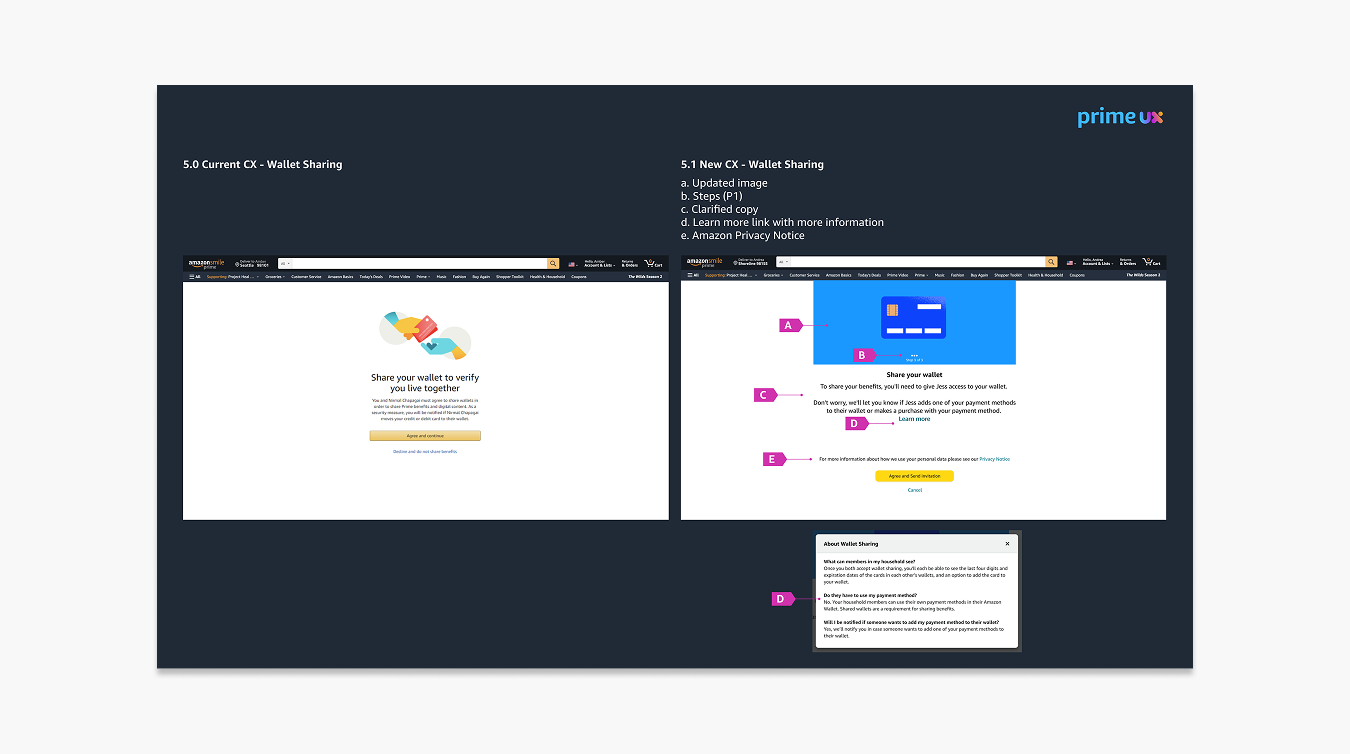 With this new constraint, I went back to our research findings. I focused on the fact that customers had a lot of questions regarding wallet sharing so I added a ‘Learn more’ link that housed the top 3 most asked questions and answers to help reduce risk and increase completion.