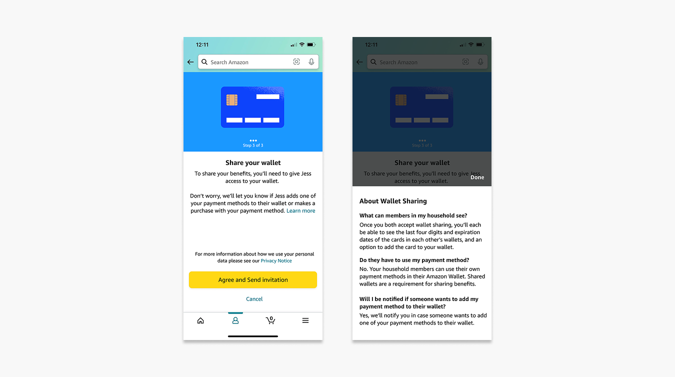 I decided to change the approach to wallet sharing and pitched the idea of sharing a single payment method instead of requiring the full wallet. My cross-functional partners agreed and felt like it would simplify things all around.